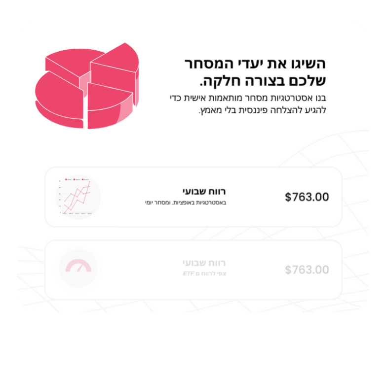 קחו שליטה על המסחר שלכם עם Trade2. למדו ויישמו אסטרטגיות מסחר מתקדמות, הגדילו את התשואות ושפרו את הביצועים שלכם בשוק ההון – הכל בצורה נוחה ובפלטפורמה עוצמתית אחת.